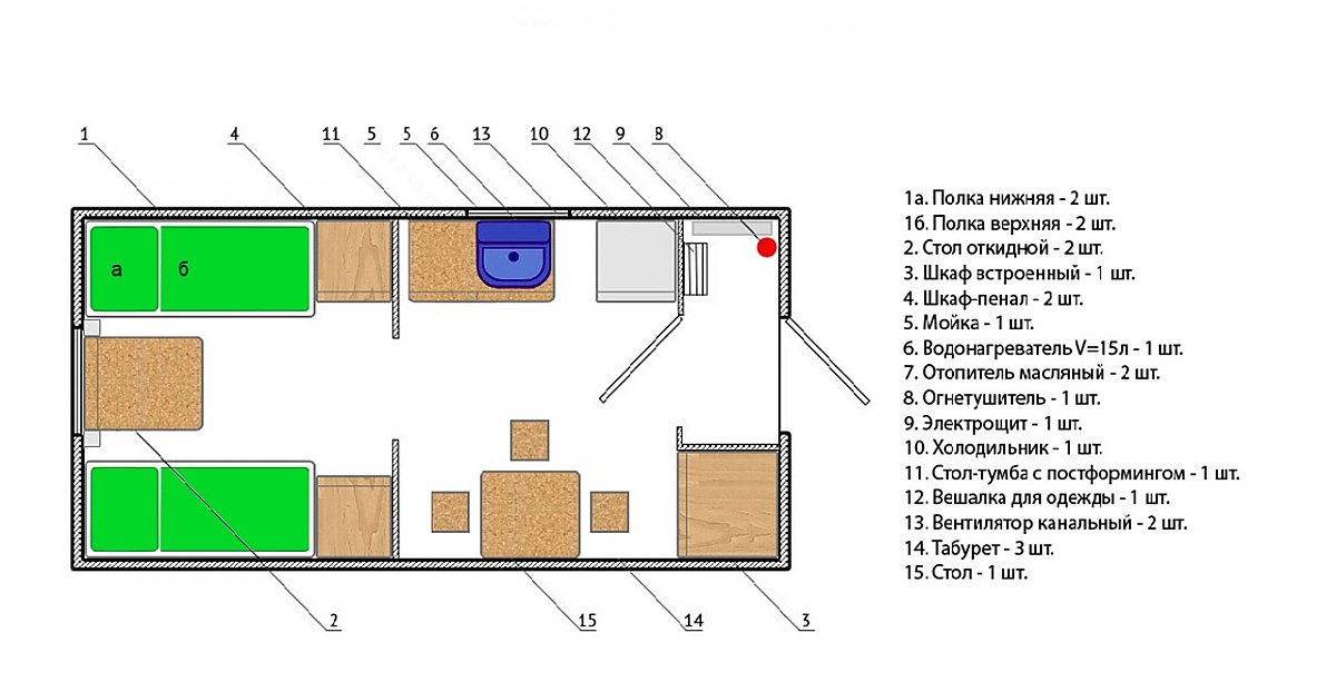 Вагон-дом 6000х2500 мм – это мобильное общежитие для 4-х человек, площадью 15 м2, на которой обустроены места для сна, отдыха, приема пищи, хранения вещей и гигиенических процедур. В таких условиях возможно длительное проживание.