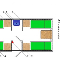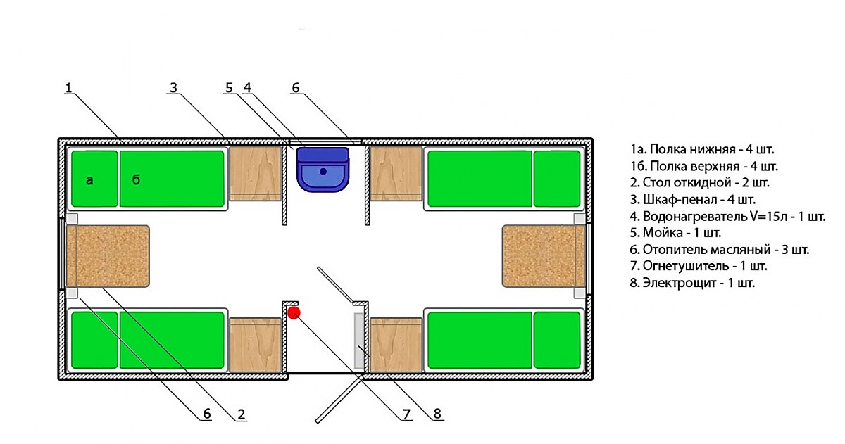 Мебель вагон-дома на 8 человек типовая, изготавливается из ЛДCП. Под заказ возможна комплектация вагон-домов мебелью, изготовленной по индивидуальным чертежам.